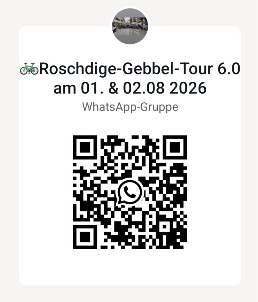 Wer mitfahren möchte, einfach an unseren Organisator Matthias Fischer, oder an Björn Klose wenden, oder noch einfacher, über diesen QR-Code in die Roschdige Gebbel Tour WhatsApp Gruppe eintreten.